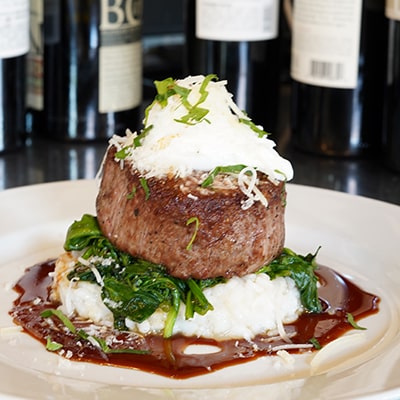 Grilled filet cooked to your liking, served with mashed potatoes, wilted spinach, topped with truffle oil, parmesan, poached egg, and a tasty bordelaise