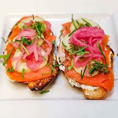 Smoked salmon served on grilled baguette slices with herb cream cheese, topped with cucumbers, capers, pickled red onion, and fresh gremolata